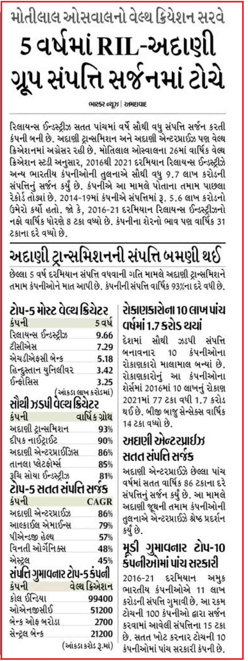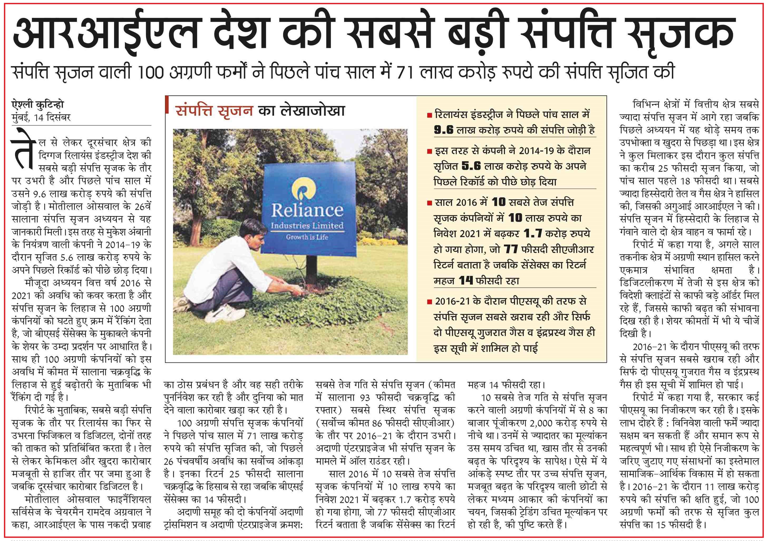 Reliance Industries largest wealth creator in 2016-21, says Motilal Oswal-Business Journal |