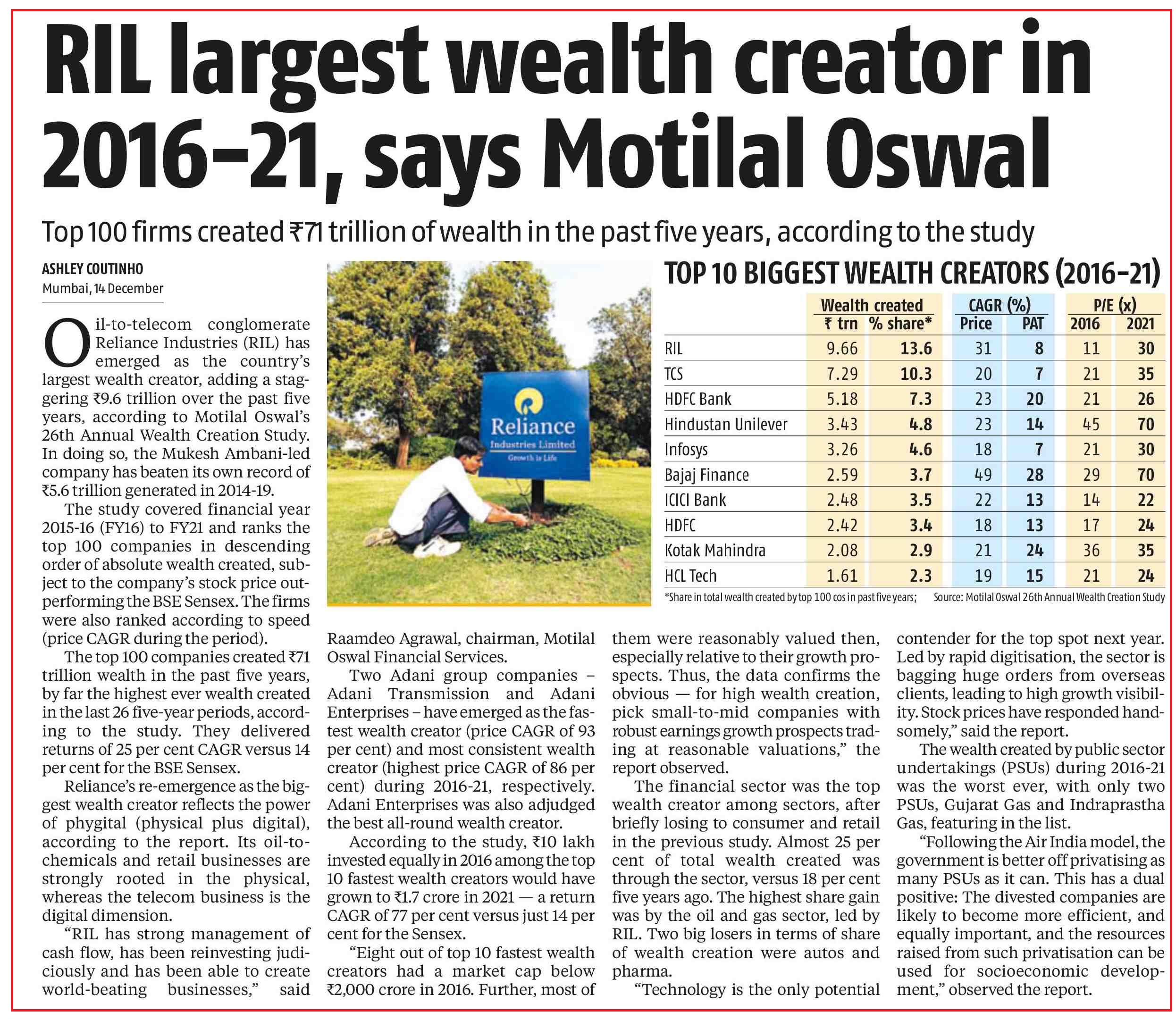 Reliance Industries largest wealth creator in 2016-21, says Motilal Oswal |