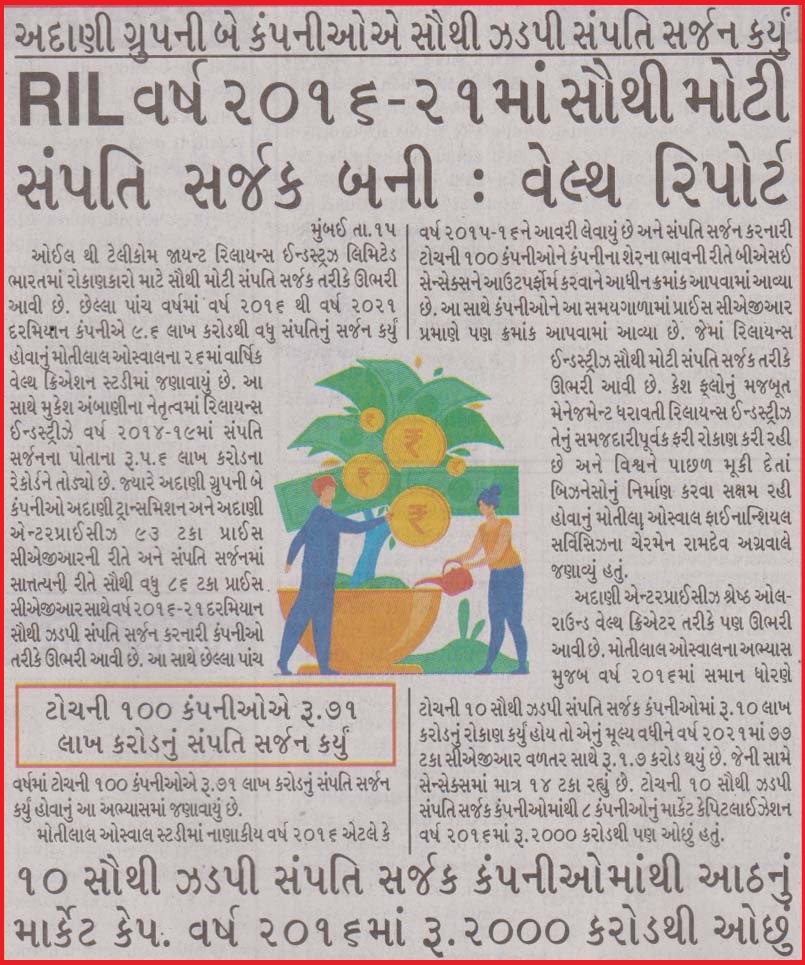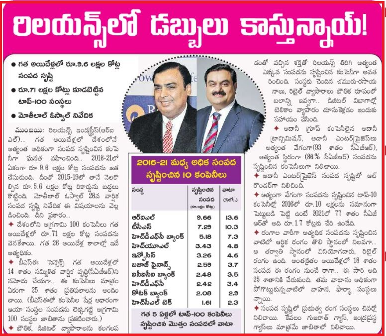 Reliance Industries largest wealth creator in 2016-21 |
