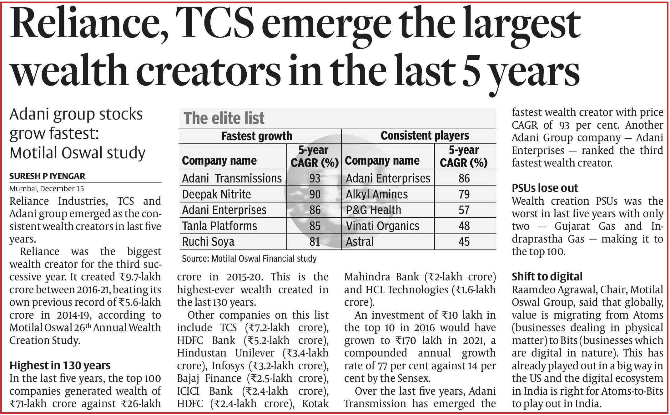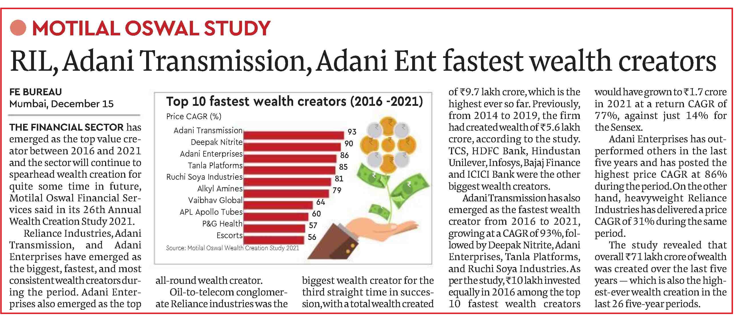 �Adani Enterprises is the most consistent wealth creator in the Motilal Oswal study -. |