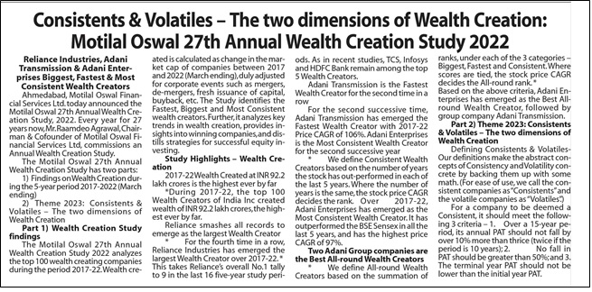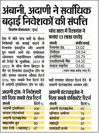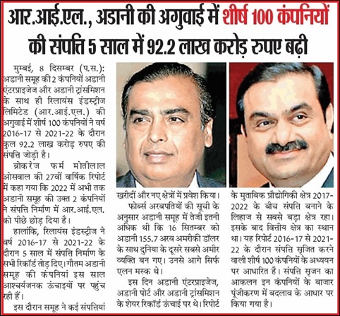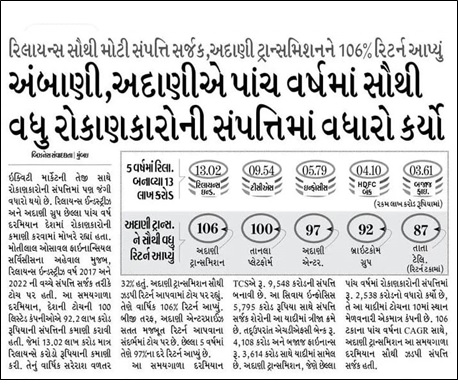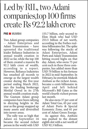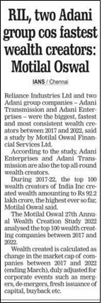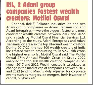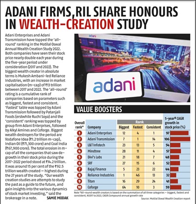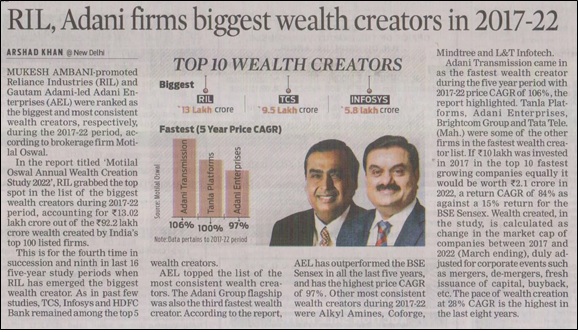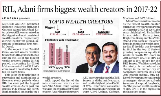 RIL, Adani firms biggest wealth creators in 2017-22 |
