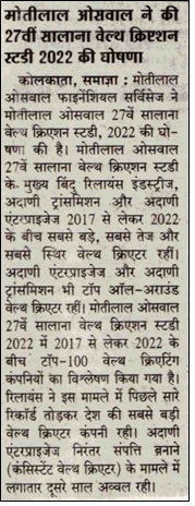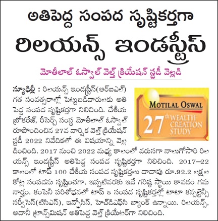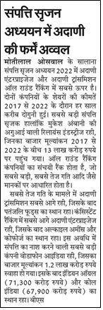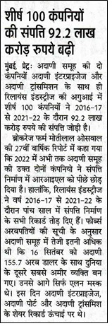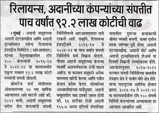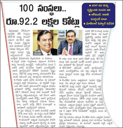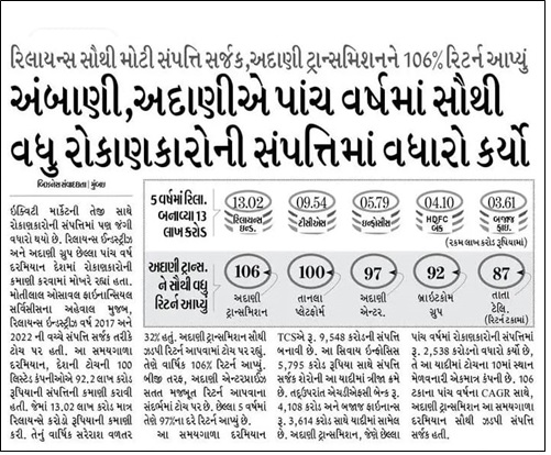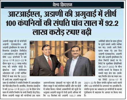 Latest News | Led by RIL, Two Adani Companies, Top 100 Firms Create Rs 92.2 Lakh Crore Wealth During FY17-22 |