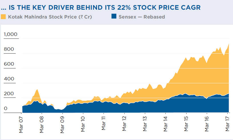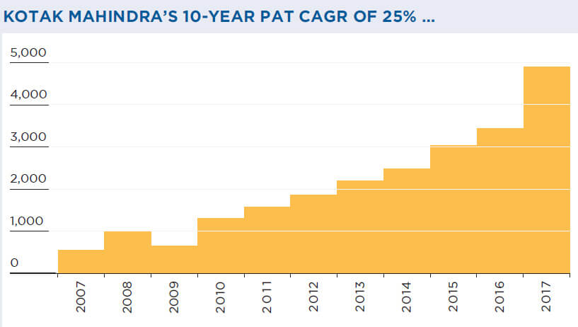 Kotak Mahindra Bank, a consistent wealth creator, registered PAT CAGR of 25% over the 10 years ending Mar-17, which has translated into a stock price CAGR of 22%.