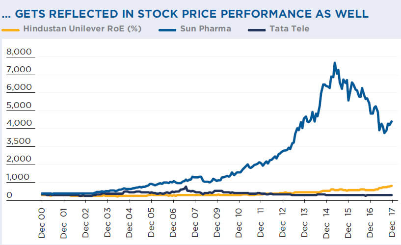 - Hindustan Unilever: The company has a wide range of well-established products (soaps & detergents, cosmetics, tea, ice-creams, etc) with a strong distribution network i.e. an enduring moat. Growth rate is not very high, but requires virtually no incremental capital (RoE levels well over 50%).