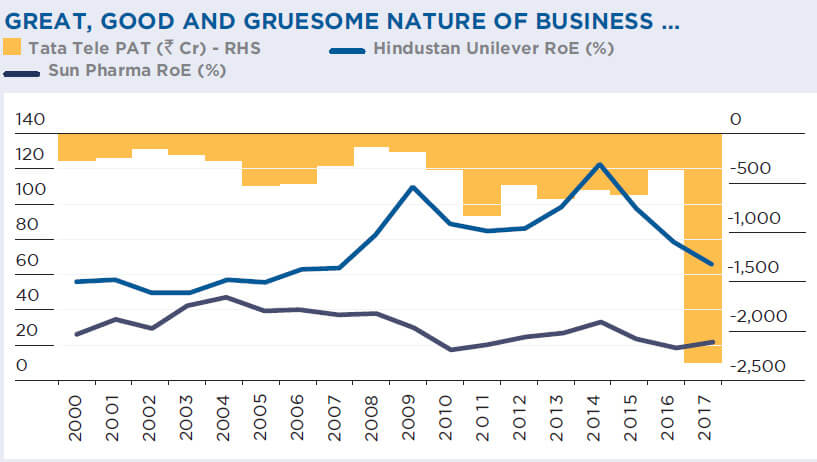 Hindustan Unilever (a Great business) requires no incremental capital; Sun Pharma (Good) requires regular capital investment; Tata Teleservices (Gruesome), unprofitable for the last 15 years, has had 7x Capital Employed growth.