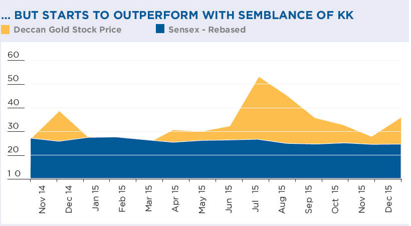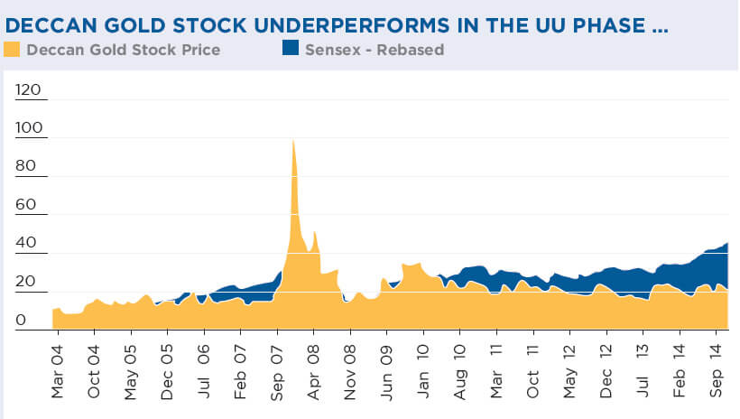 Deccan Gold Mines underperformed in the UU phase during Jan-10 to Sep-14. However, post that, the stock price has improved significantly.