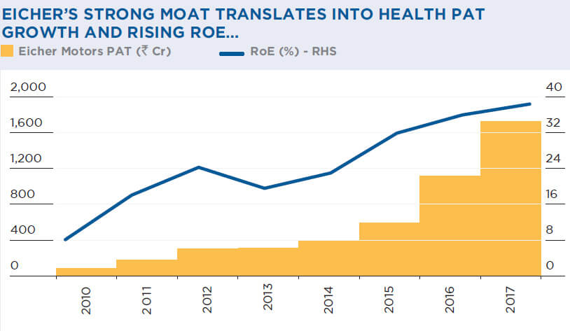 Eicher derives its Economic Moat from its 95% market share in leisure bikes and a majority stake in India’s third largest CV player. The company has seen rising PAT and RoE, and the stock has handsomely outperformed the market in the last seven years.